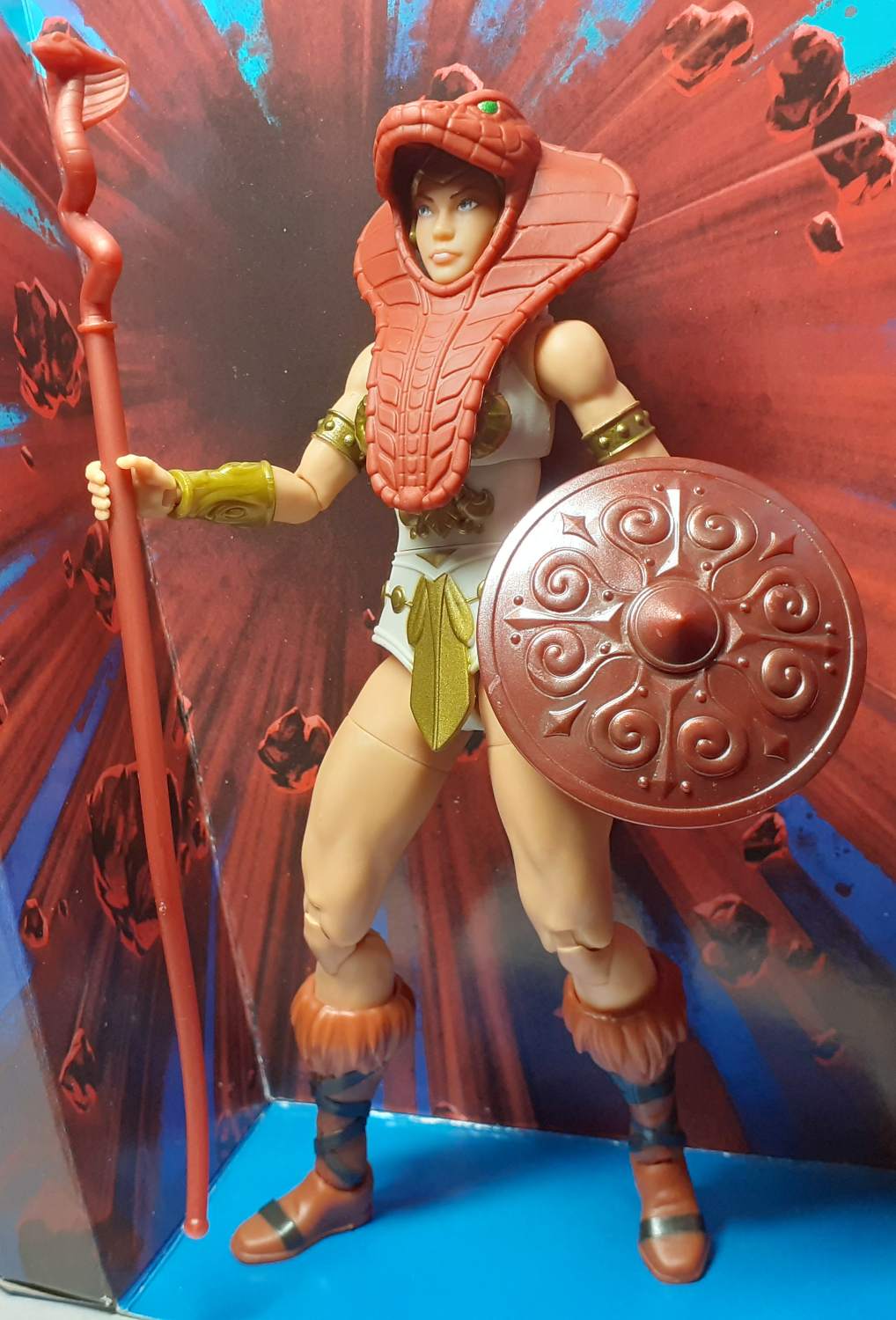 Both sets also have different details and sizing. If you look at the snake armour on Vintage Collection Teela, it flares out more around the head compared to New Eternia Teela. The snake head design on the New Eternia Teela’s staff is much larger than the Vintage Collection equivalent.