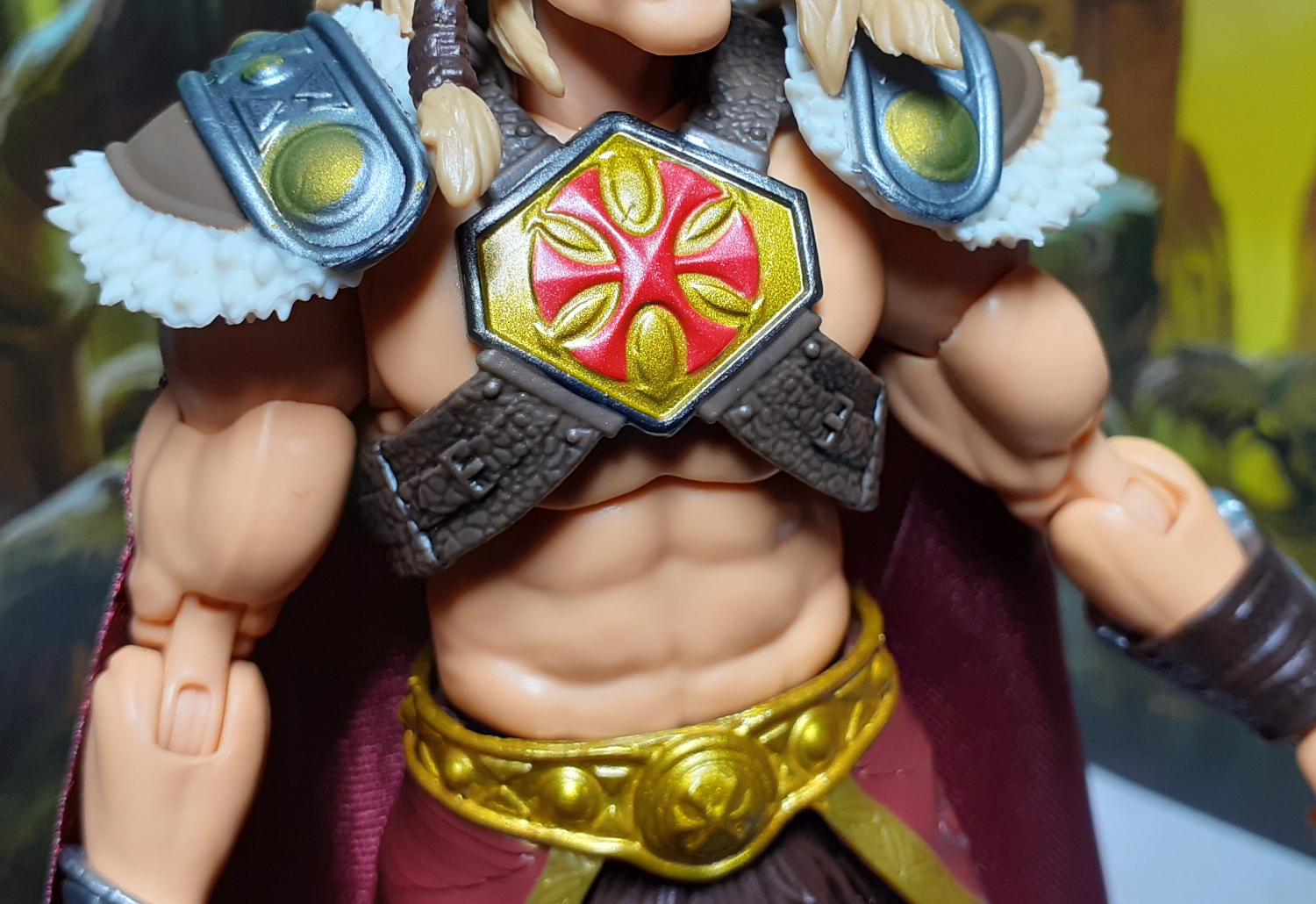 Along with the new designs some traditional elements are retained. The “asterisk” chest design (mirrored on the shield), the red cape with a ragged edge and the fur on the shoulders. It’s a shame this figure doesn’t have the faux fur or the wired cape of the Masterverse version. This does feel like a down grade and a shame considering this new figure is a Mattel Creations deluxe figure.