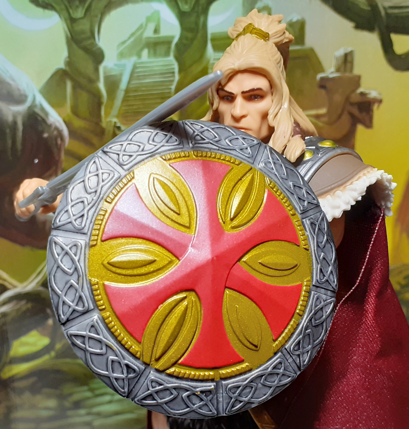The shield is the best of the accessories by quite a long way. The design is gorgeous with a large central area featuring the red and gold emblem for King Grayskull. The shield edge is covered with more knot work designs and this also has a dark wash over it. It comes together really well and shows up the poor effort with the Sword!
